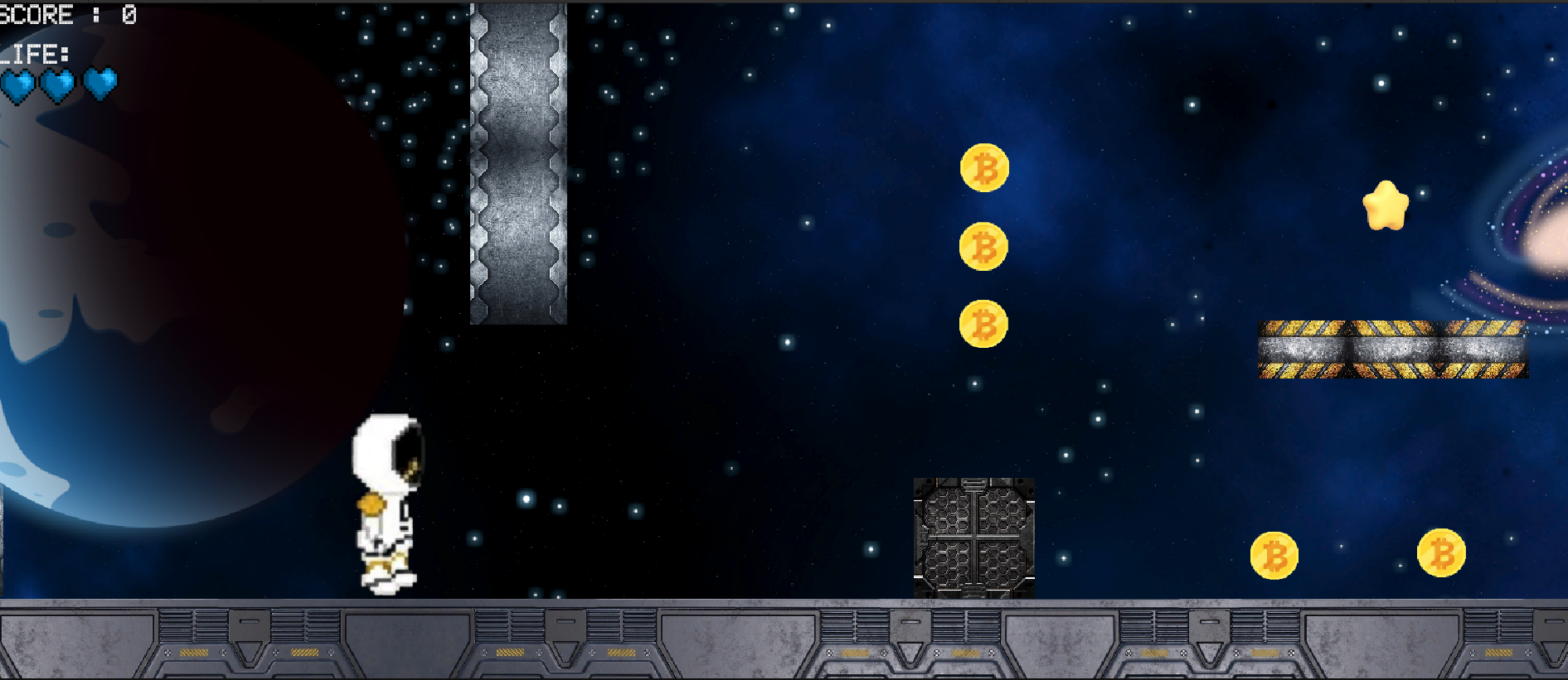 In Space Walker, you control an astronaut in a 2D side-scrolling environment, dodging falling rocks and collecting life bonuses along the way. The goal is to reach the end of the level while avoiding obstacles that can knock you out.
